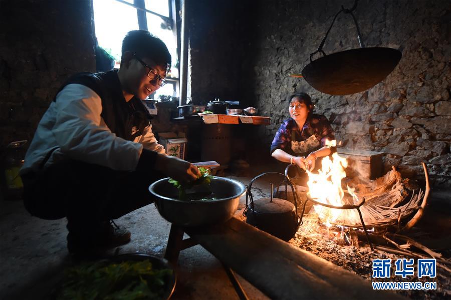 2017年6月13日,重庆城口县周溪乡凉风村的扶贫志愿者、毕业于重庆理工大学的刘峻潇(左)在村民家中帮忙生火做饭。