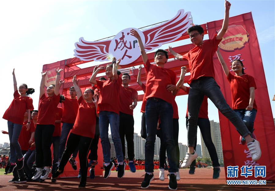 安徽淮南市第二中学学生穿越“成人门”(2018年5月4日摄)。