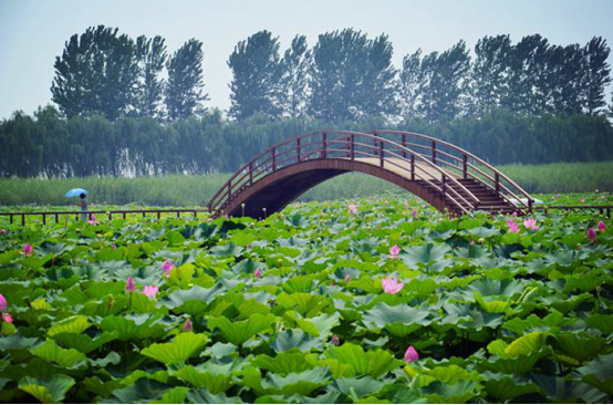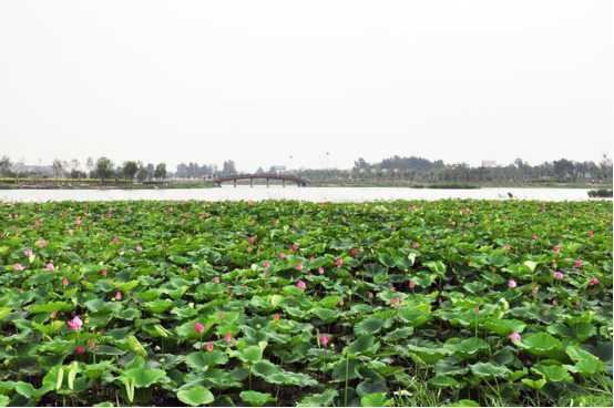 潮白河秀水街大桥生态公园有荷花近1000亩,和垂柳、法桐、油松、水彬、火炬、黄杨等景观树木交相辉映,别具风情。