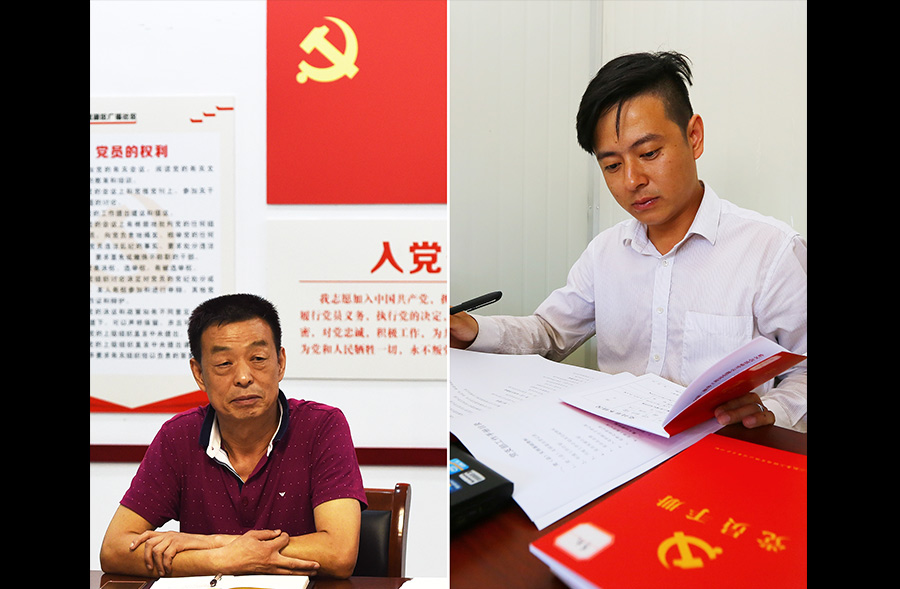 拼版照片:左图为2017年6月30日,陶起良在安徽省芜湖市广福社区参加迎“七一”党员交流活动(新华社记者郭晨摄)。右图为2017年6月21日,在位于塞尔维亚奥布雷诺瓦茨的项目部,陶涛在翻阅党员手册(新华社记者龚兵摄)。一位近40年党龄的老党员,兢兢业业坚守纺织生产一线直至退休;一位“七一”生日的新党员,走出国门参与“一带一路”项目建设。身在安徽芜湖的陶起良和身在塞尔维亚的陶涛,父子二人用行动诠释他们的党性本色和家风传承。 新华社发