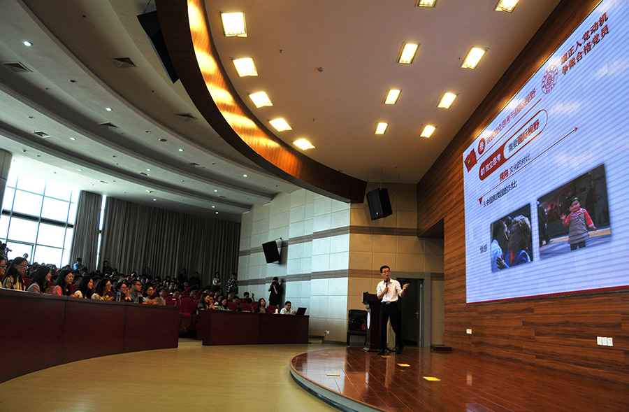 2016年5月16日,徐川在南京航空航天大学报告厅给同学们上《端正入党动机 争做合格党员》党课。 新华社记者 林凯 摄