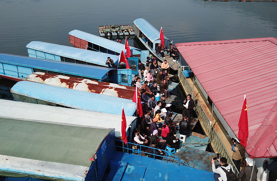 2017年11月1日,村民在广西百色市隆林各族自治县天生桥镇水上讲习所聆听党的十九大精神宣讲。 新华社记者 周华 摄