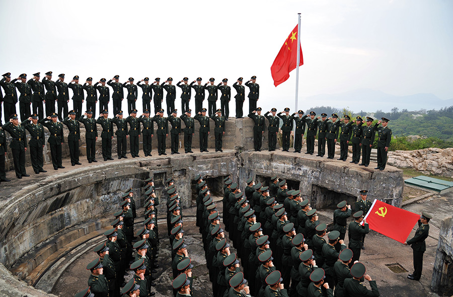 党的群众路线教育实践活动中,“大渡河连”组织党员重温入党誓词(2012年3月25日摄)。这个连诞生于1927年秋收起义,是“支部建在连上”最早的连队之一。1935年5月25日,长征途中,17名勇士冒着枪林弹雨,强渡大渡河,为红军北上打开了胜利通道,被誉为英雄的“大渡河连”。 新华社发(程小林 摄)