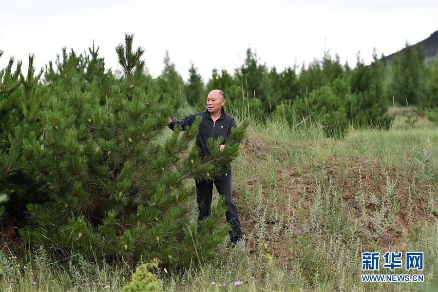 在山西省右玉县李达窑乡马头山,李云生在查看松树的生长情况(2017年7月24日摄)。