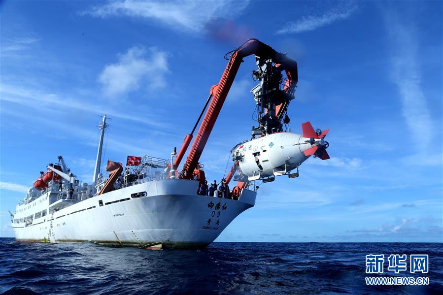 “蛟龙”号载人潜水器进入水中,进行中国大洋38航次最后一潜(2017年6月13日摄)。