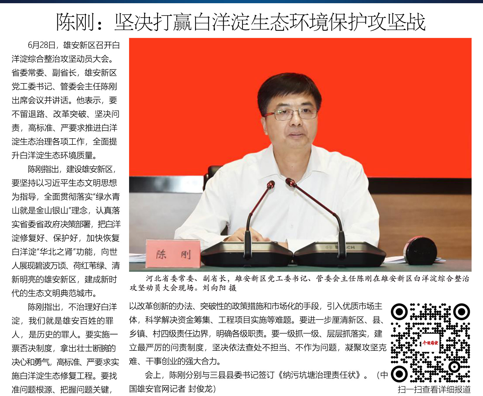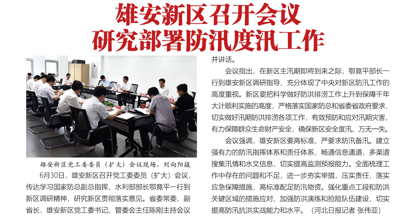 6月30日,雄安新区召开党工委委员(扩大)会议,传达学习国家防总副总指挥、水利部部长鄂竟平一行到新区调研精神,研究新区贯彻落实意见。省委常委、副省长,雄安新区党工委书记、管委会主任陈刚主持会议并讲话。