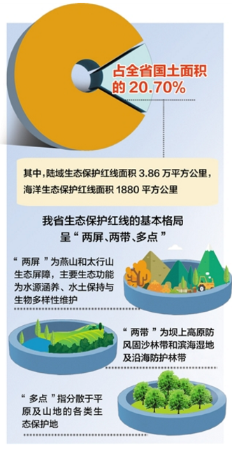 日前,省政府出台《河北省生态保护红线》,明确全省生态保护红线总面积4.05万平方公里,占全省面积的20.70%。其中,陆域生态保护红线面积3.86万平方公里,占全省陆域国土面积的20.49%;海洋生态保护红线面积1880平方公里,占全省管辖海域面积的26.02%。