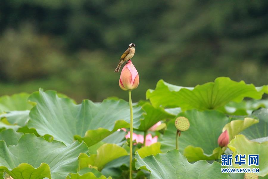 在湖南省湘西土家族苗族自治州龙山县石羔街道泗坪村,一只小鸟停留在荷花花苞上(7月1日摄)。