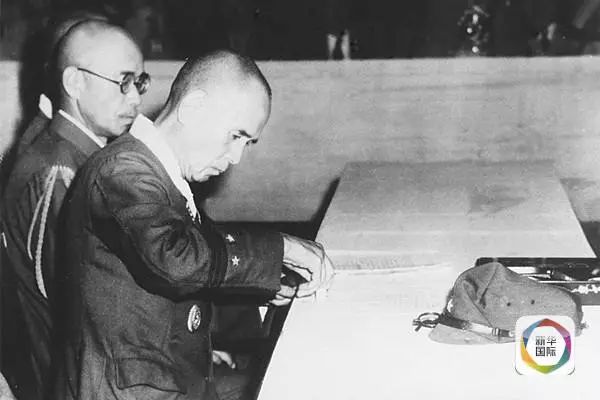 这是侵华日军总司令冈村宁次等在南京签盖降书。冈村宁次还向中方交出他的随身佩刀,以表示侵华日军正式向中国缴械投降。