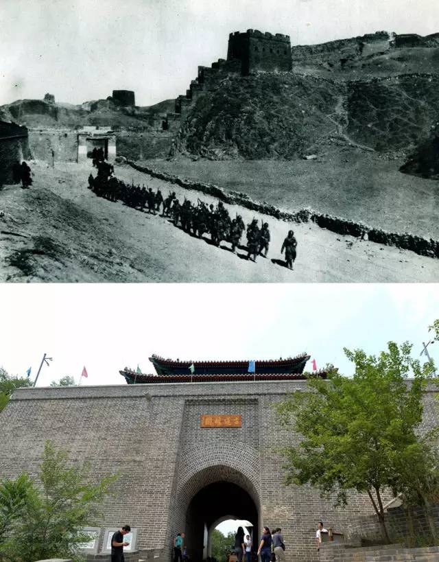 上图为日军进入古北口镇城门(资料照片);下图为2017年6月21日拍摄的古北口镇城门(新华社记者 王化娟 摄)。