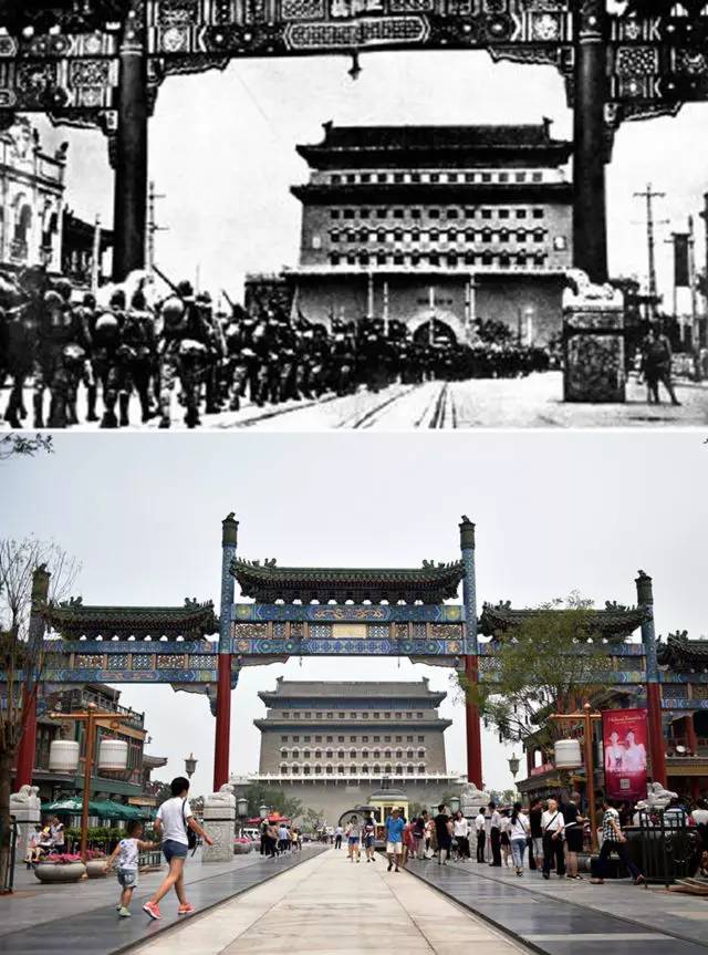 上图为1937年7月29日,日军侵入正阳门(资料照片);下图为2017年7月3日拍摄的正阳门(新华社记者 张晨霖 摄)。