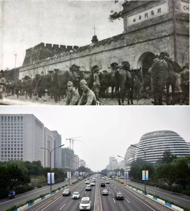 上图为1937年8月8日,日本骑兵在朝阳门车站集结(资料照片);下图为2017年7月3日拍摄的朝阳门地区(新华社记者 张晨霖 摄)。