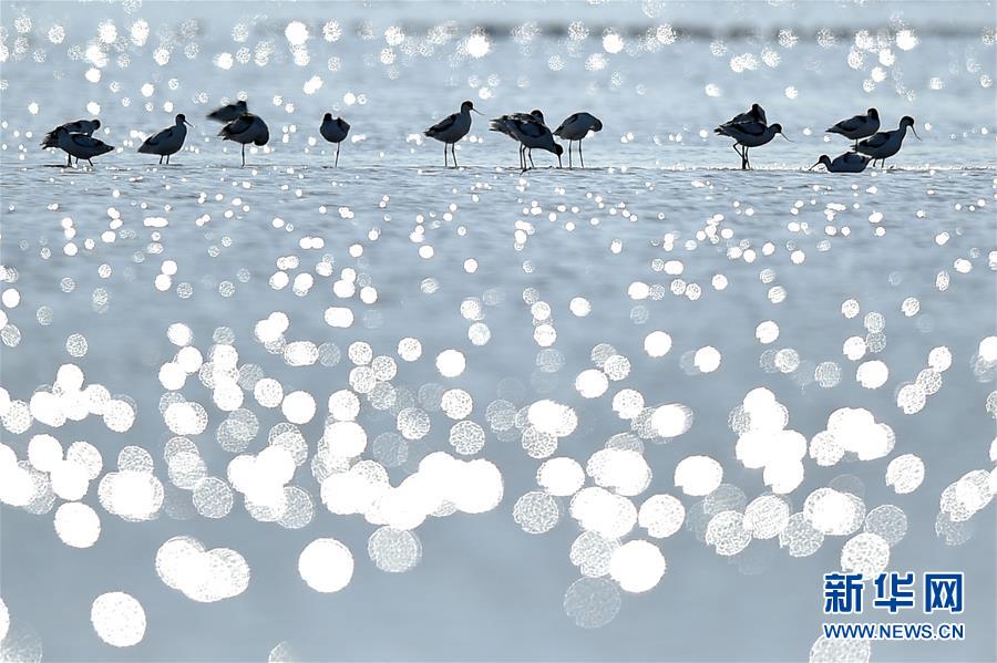 成群候鸟在天津滨海新区北大港湿地万亩鱼塘栖息(2017年11月15日摄)。