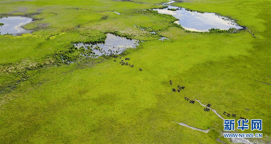 这是内蒙古呼伦贝尔市辉河湿地风光(2017年7月1日无人机拍摄)。