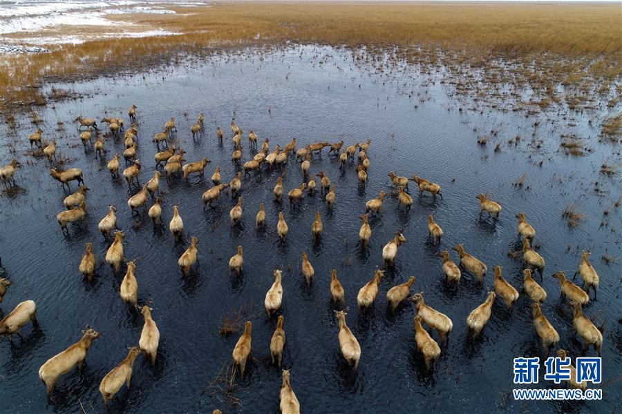 在江苏盐城大丰黄海湿地麋鹿自然保护区内,麋鹿在觅食(2018年1月25日无人机拍摄)。