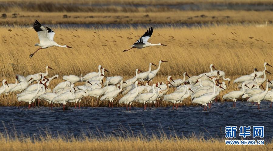 白鹤群在吉林省白城市镇赉县的莫莫格湿地翔集(2018年4月26日摄)。