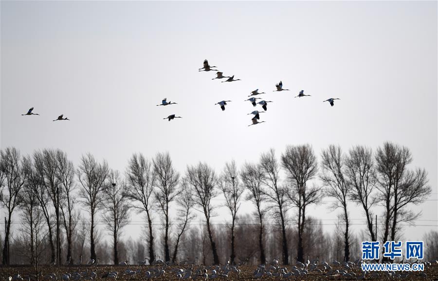 白鹤群在吉林省白城市镇赉县的莫莫格湿地飞翔(2018年4月3日摄)。