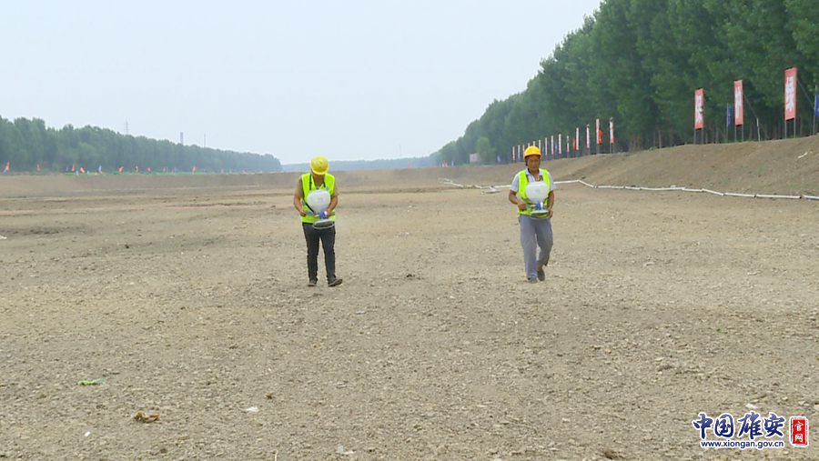 6月25日,唐河污水库现场施工人员正在进行人工播种。记者马梦迪 摄