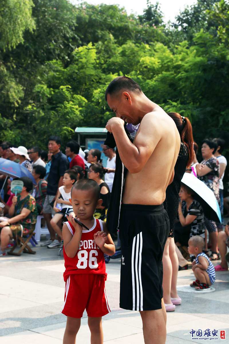 别人都在看演出,而我的眼里只有你,“来,脱下衣服帮你挡太阳”。记者张仕林 摄