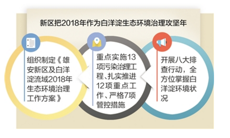 新区还把2018年作为白洋淀生态环境治理攻坚年,组织制定《雄安新区及白洋淀流域2018年生态环境治理工作方案》,重点实施13项污染治理工程、扎实推进12项重点工作、严格7项管控措施。参与编制《白洋淀流域治理实施方案(2018-2020年)》,开展八大排查行动,全方位掌握白洋淀环境状况。