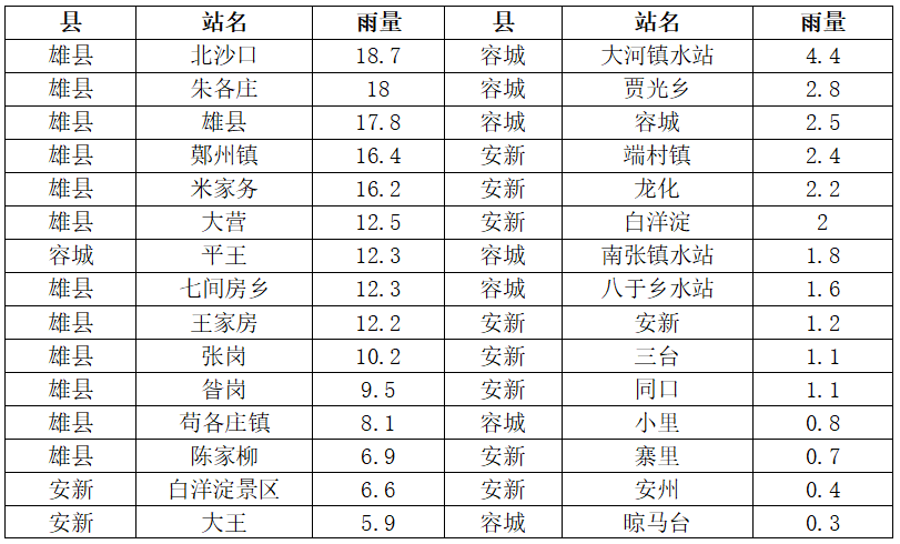 2018年7月23日20时至24日12时雄安新区降水量(单位:毫米)