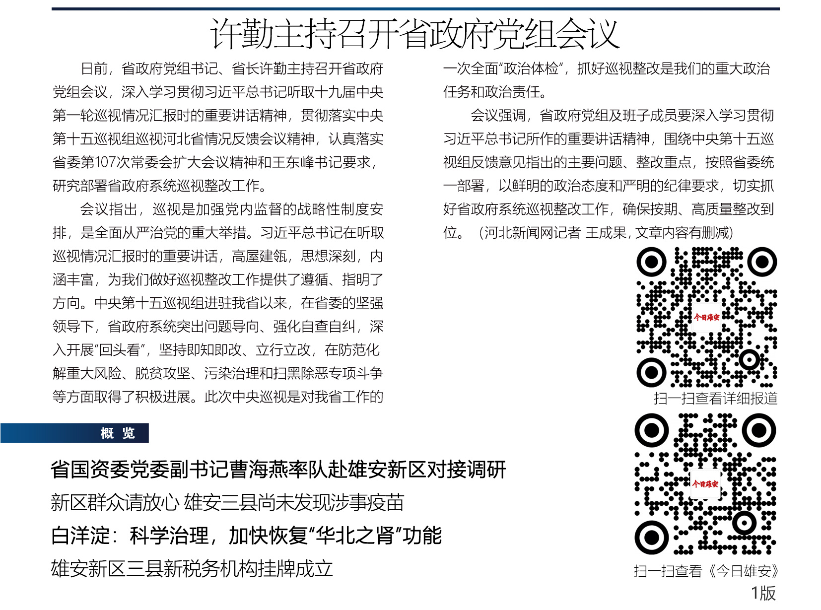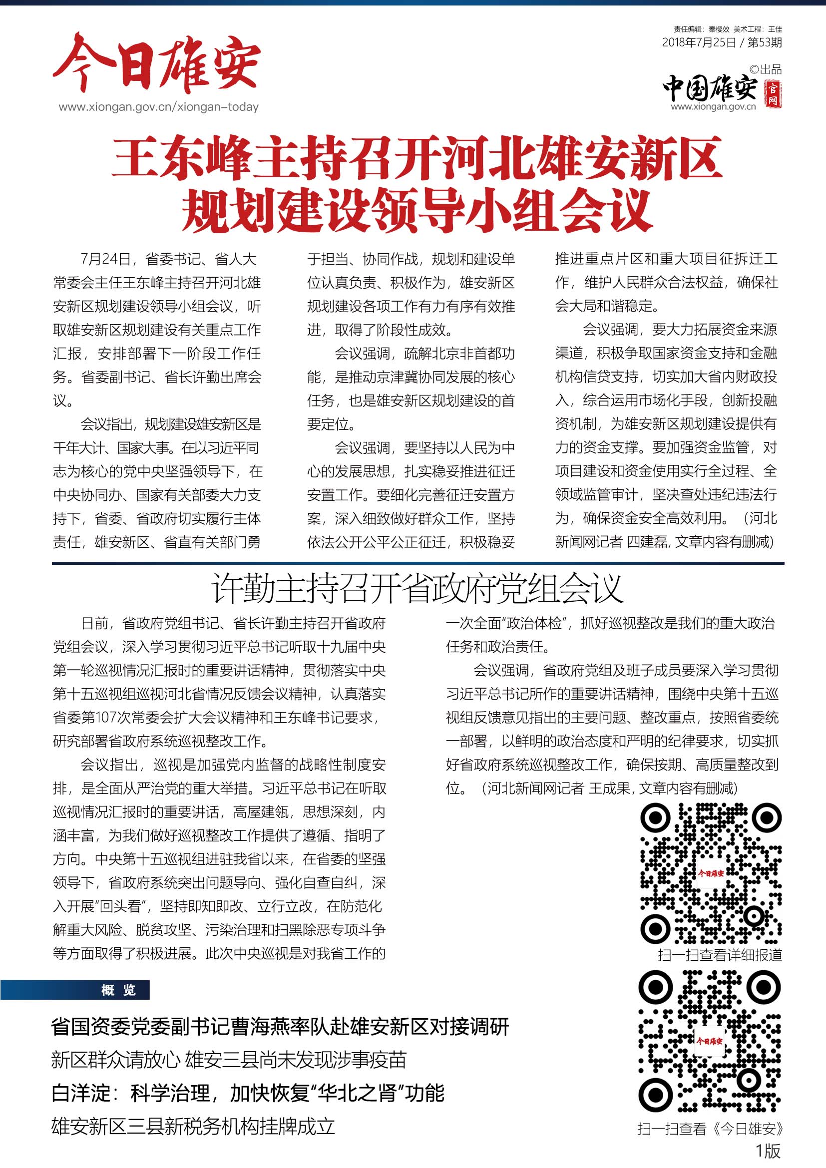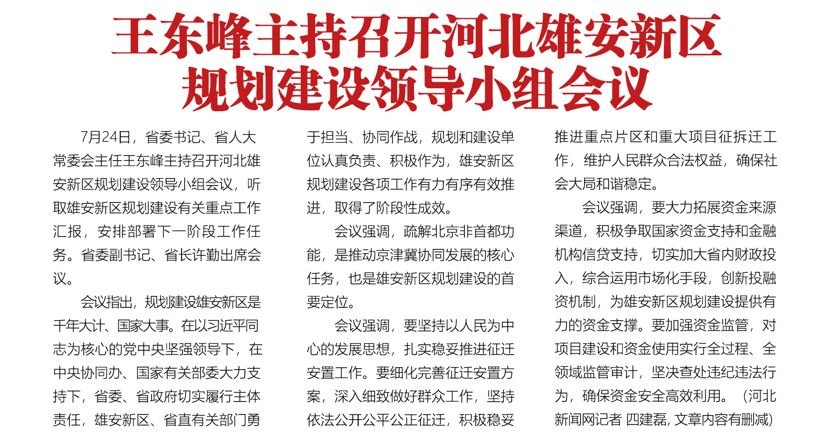 7月24日,省委书记、省人大常委会主任王东峰主持召开河北雄安新区规划建设领导小组会议,听取雄安新区规划建设有关重点工作汇报,安排部署下一阶段工作任务。