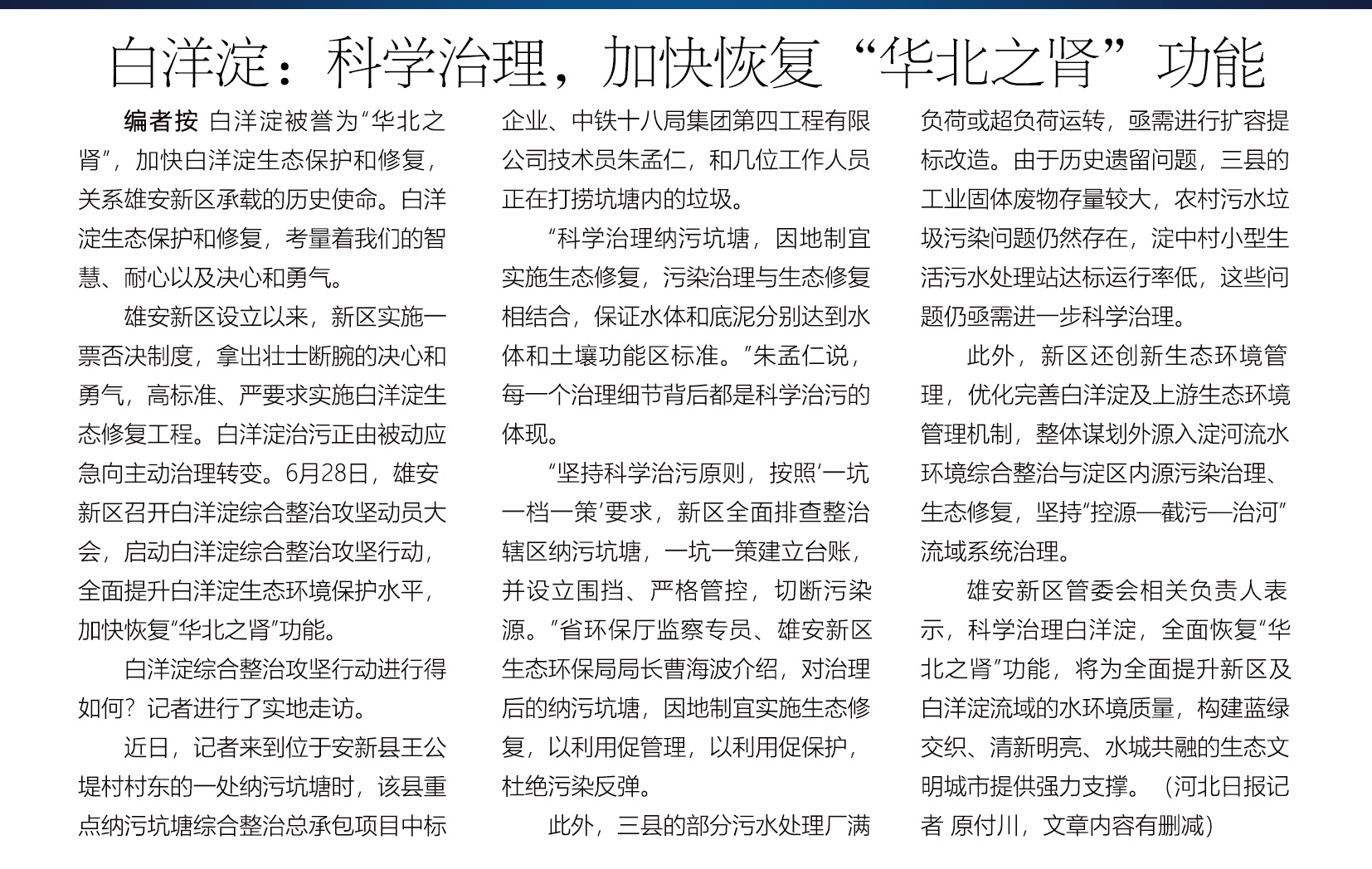 白洋淀被誉为“华北之肾”,加快白洋淀生态保护和修复,关系雄安新区承载的历史使命。白洋淀生态保护和修复,考量着我们的智慧、耐心以及决心和勇气。