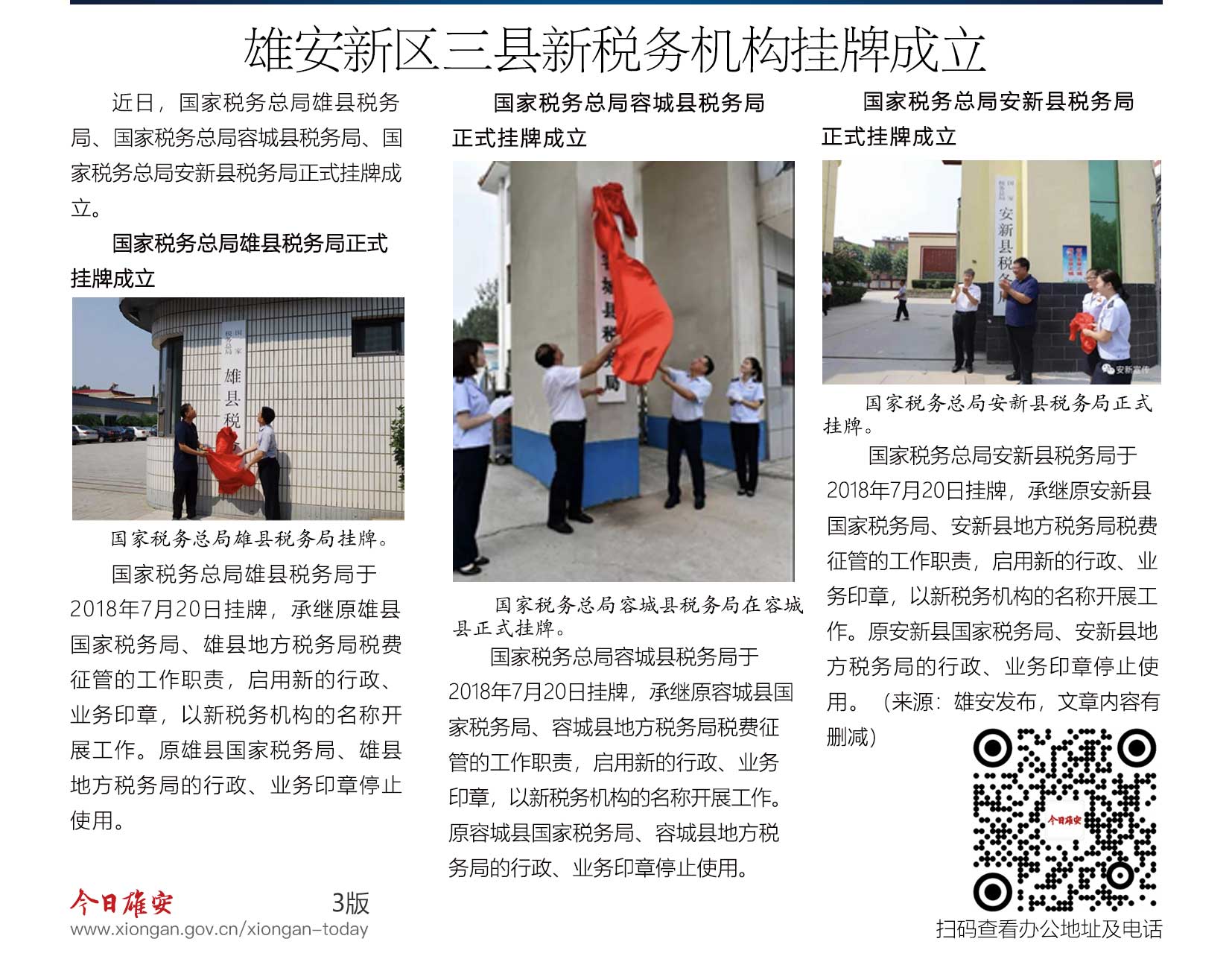 近日,国家税务总局雄县税务局、国家税务总局容城县税务局、国家税务总局安新县税务局正式挂牌成立。