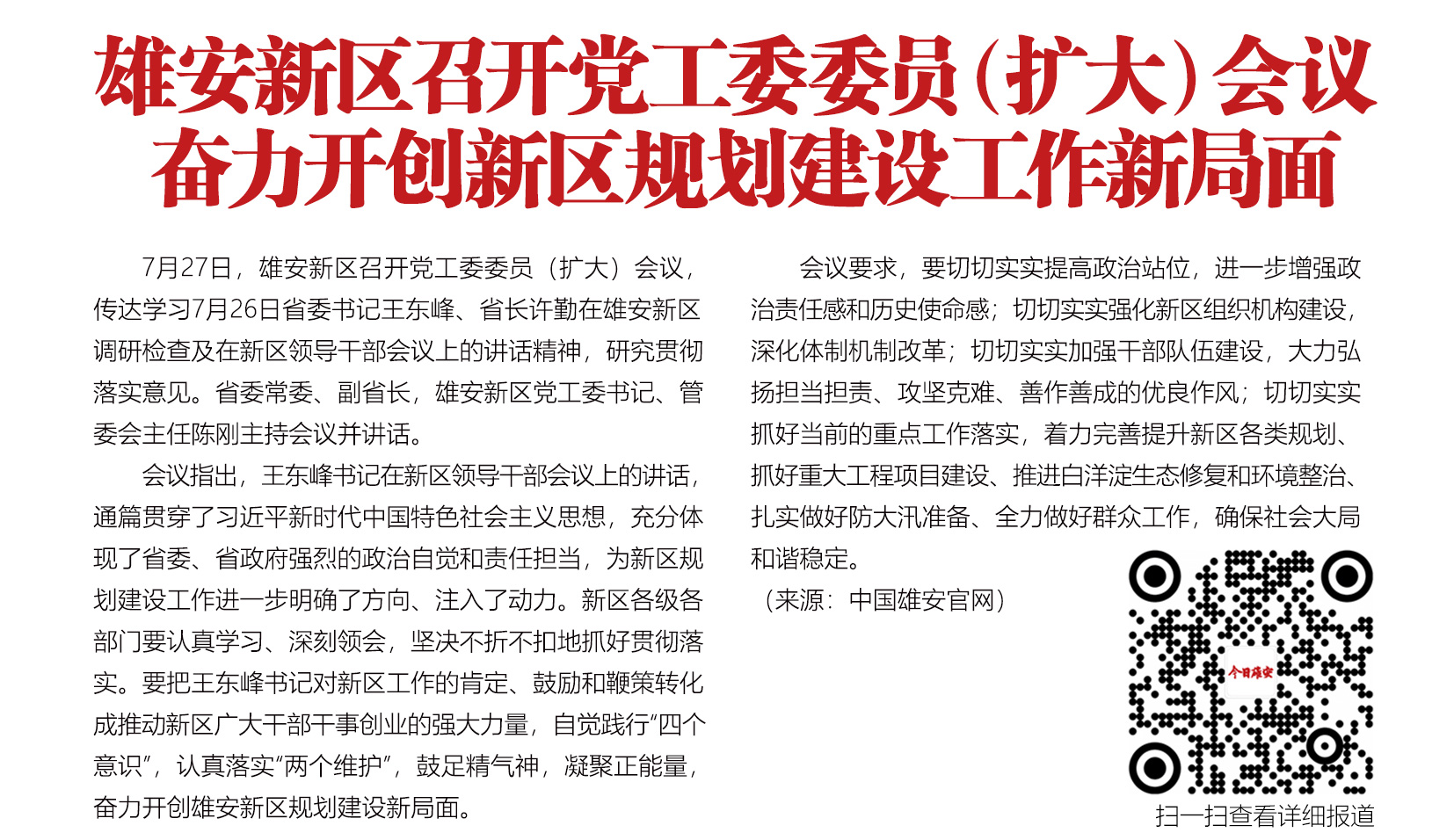 7月24日,雄安新区召开党工委委员(扩大)会议,传达全省经济发展推进会、省全面从严治党暨中央巡视反馈意见整改落实推进会和河北雄安新区规划建设领导小组会议精神,研究新区贯彻落实意见。