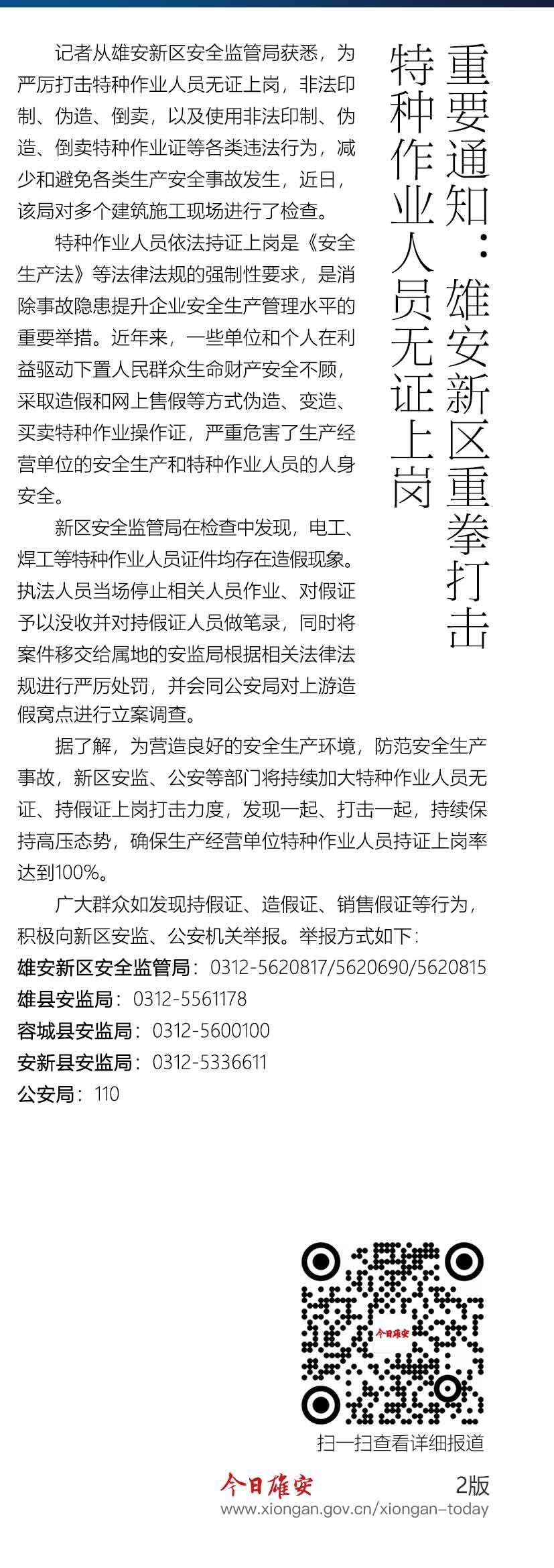 新区安监、公安等部门将持续加大特种作业人员无证、持假证上岗打击力度,发现一起、打击一起,持续保持高压态势,确保生产经营单位特种作业人员持证上岗率达到100%。