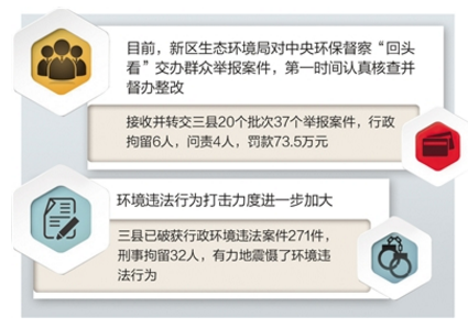 目前,新区生态环境局对中央环保督察“回头看”交办群众举报案件,第一时间认真核查并督办整改,接收并转交三县20个批次37个举报案件,行政拘留6人,问责4人,罚款73.5万元。环境违法行为打击力度进一步加大,三县已破获行政环境违法案件271件,刑事拘留32人,有力地震慑了环境违法行为。(记者 张伟亚)