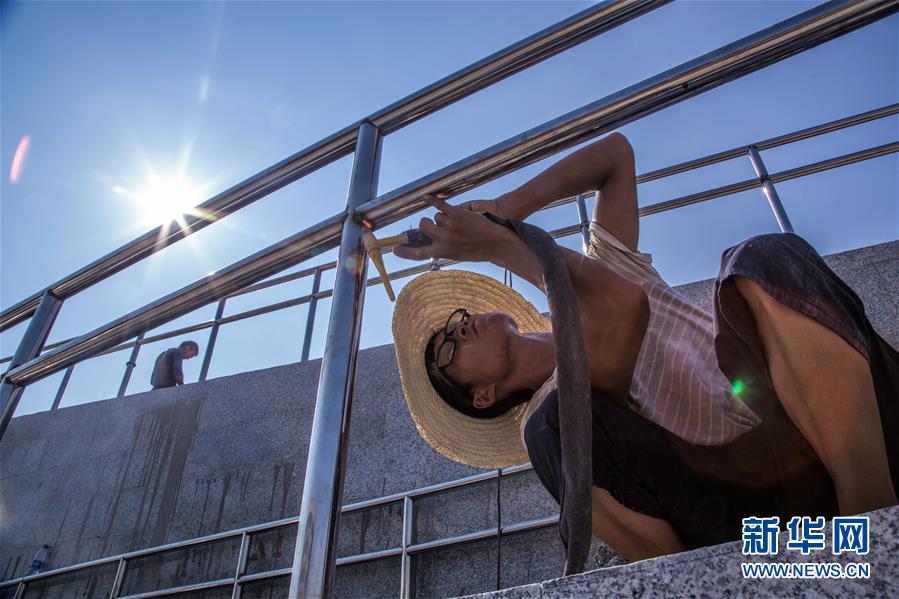 7月30日,在江西省九江市一处建筑工地,一名工人在查看焊接处的缝隙。 烈日炎炎,热浪袭人。建筑工地的劳动者不畏酷暑,坚守岗位,为城市的建设奉献汗水。 新华社发(杨牧青 摄)