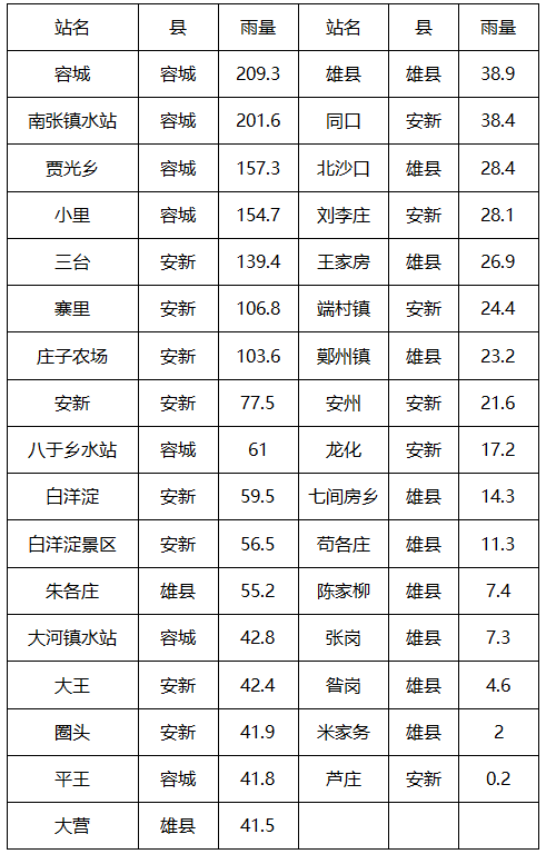 据气象部门统计,雄安新区有6站出现中雨,10站出现大雨,5站出现暴雨,7站出现大暴雨。6日早上8时,新区大部分地区的降雨基本结束,雄安新区气象局筹备处解除了暴雨橙色预警和雷电黄色预警。