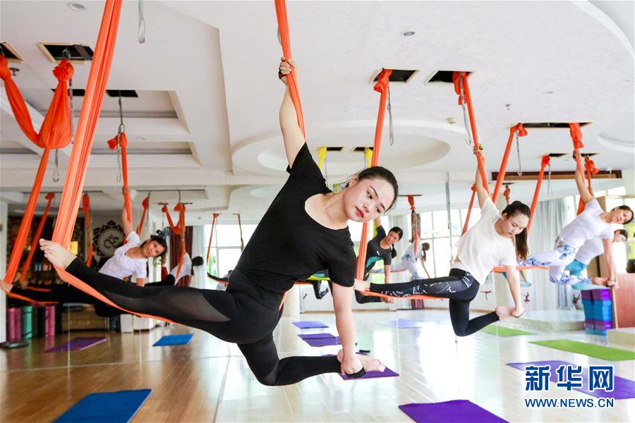 8月8日,瑜伽爱好者在江西省峡江县一家瑜伽馆内练习瑜伽。 当日是全民健身日,各地举行丰富多彩的健身活动,倡导文明健康的生活方式。 新华社发(陈福平 摄)