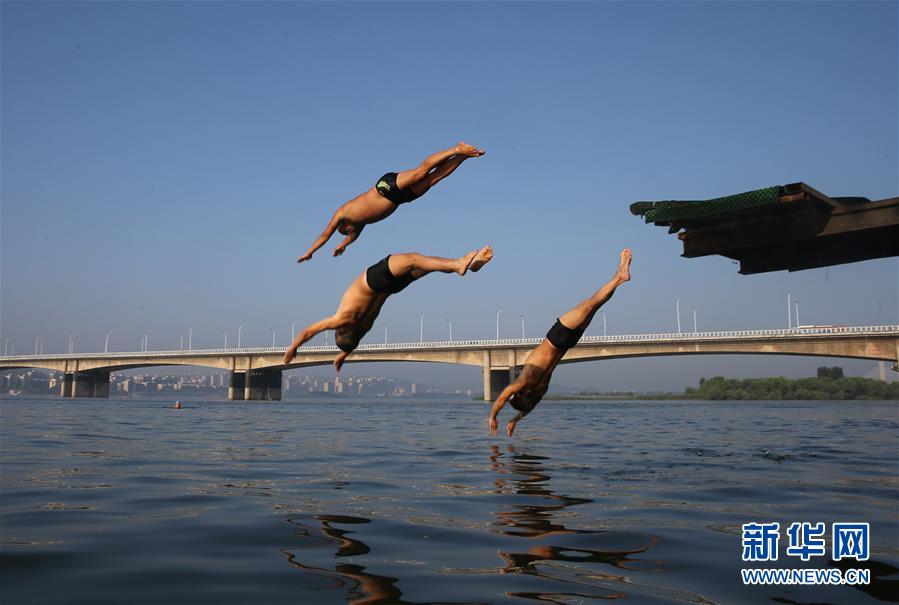 8月8日,汉江湖北襄阳段,跳水爱好者在练习跳水。 当日是全民健身日,各地举行丰富多彩的健身活动,倡导文明健康的生活方式。 新华社发(王虎 摄)