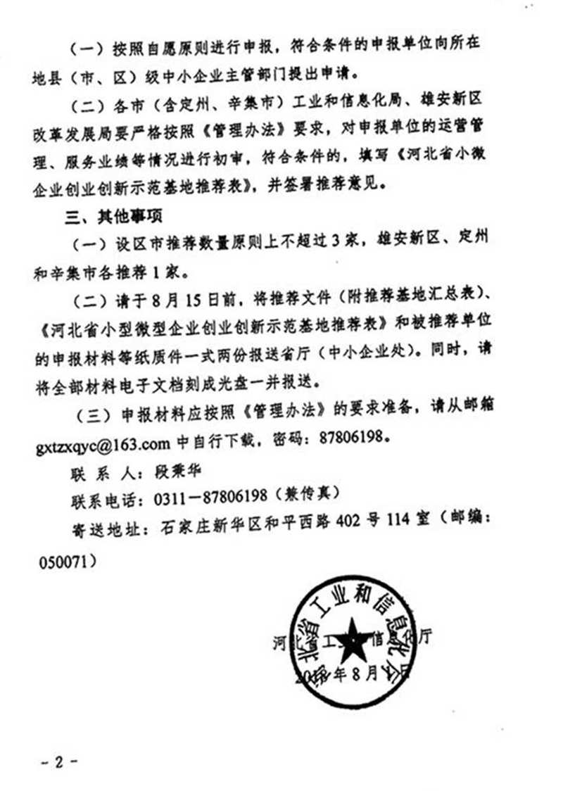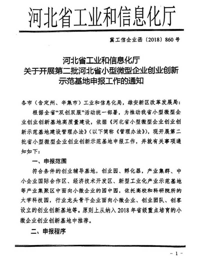 根据全省“双创双服”活动统一部署,为推动我省小型微型企业创业创新基地高质量建设,根据《河北省小型微型企业创业创新示范基地建设管理办法》,现开展第二批小型微型企业创业创新示范基地申报工作。