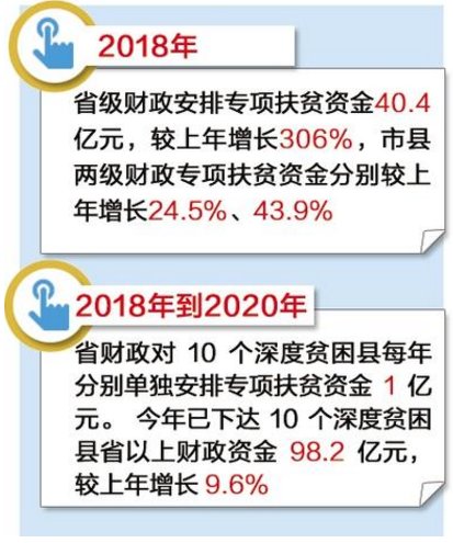 加大扶贫资金投入。2018年省级财政安排专项扶贫资金40.4亿元,较上年增长306%,市县两级财政专项扶贫资金分别较上年增长24.5%、43.9%。