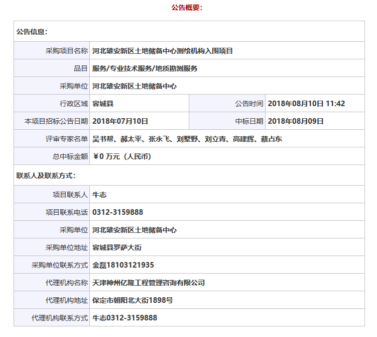 天津神州亿隆工程管理咨询有限公司受河北雄安新区土地储备中心的委托,就“河北雄安新区土地储备中心测绘机构入围项目”项目(项目编号:SZYL-2018-010)组织采购,评标工作已经结束,中标结果如下:
