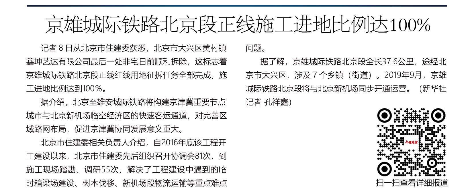 北京市大兴区黄村镇鑫坤艺达有限公司最后一处非宅日前顺利拆除,这标志着京雄城际铁路北京段正线红线用地征拆任务全部完成,施工进地比例达到100%。