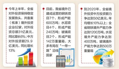 目前,我省境外已建成运营的钢铁项目7个,形成产能600万吨;水泥项目4个,形成产能240万吨;玻璃项目2个,形成产能142万重量箱,大多布局在“一带一路”沿线国家。境外在建钢铁项目5个,投产后可形成产能800万吨。