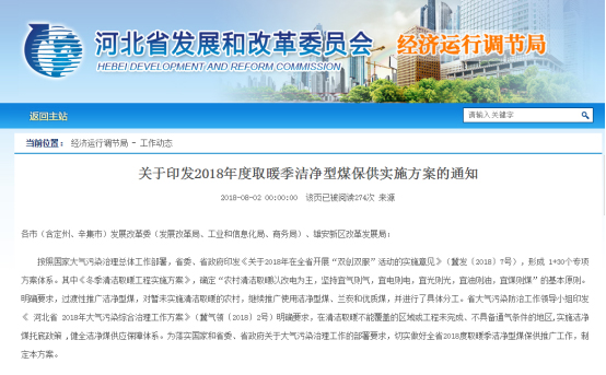 今年年初,河北省委、省政府印发《关于2018年在全省开展“双创双服”活动的实施意见》,形成“1+30”个专项方案体系。其中,《冬季清洁取暖工程实施方案》确定“农村清洁取暖以改电为主,坚持宜气则气、宜电则电、宜光则光、宜油则油、宜煤则煤”的基本原则,明确要求过渡性推广洁净型煤,对暂未实施清洁取暖的农村,继续推广使用洁净型煤、兰炭和优质煤。