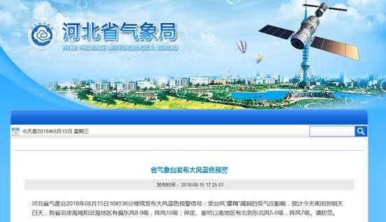 河北省气象台8月15日17时发布大风蓝色预警信号,受台风“摩羯”减弱的低气压影响,15日夜间到16日白天,河北省沿岸海域和沿海地区有偏东风8到9级,阵风10级。保定、廊坊以南地区有北到东北风5到6级,阵风7级。