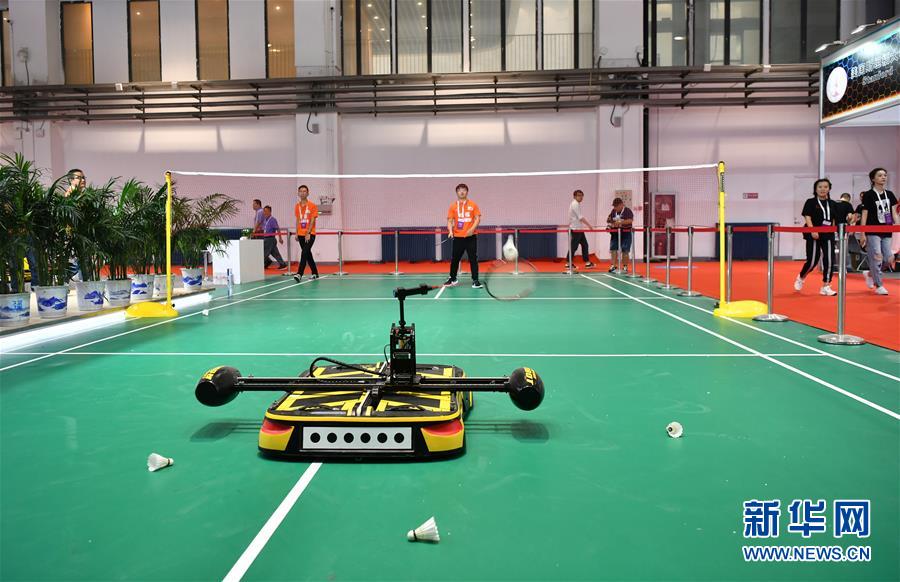 8月15日,荷福羽毛球运动陪伴机器人在跟展台工作人员打羽毛球。 当日,2018世界机器人大会在北京亦创国际会展中心开幕。大会以“共创智慧新动能,共享开放新时代”为主题,由论坛、博览会、大赛、地面无人系统活动四大板块组成。 新华社记者 李鑫 摄
