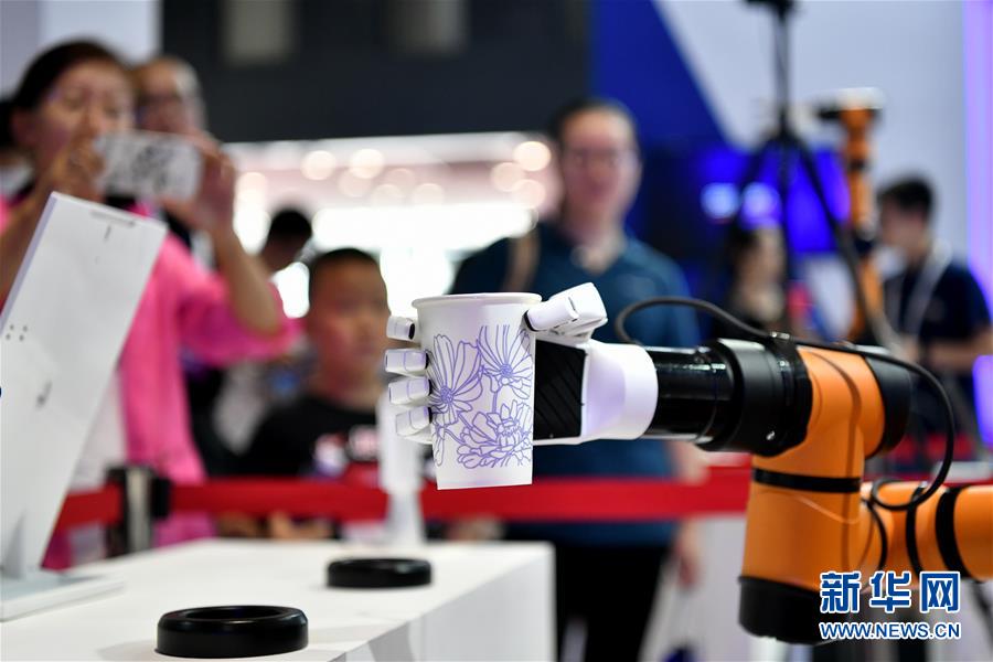8月15日,参观者在博览会上观看机器人灵巧手运水。该机器人灵巧手可应用于机器人、假肢、教育科研等领域。 当日,2018世界机器人大会在北京亦创国际会展中心开幕。大会以“共创智慧新动能,共享开放新时代”为主题,由论坛、博览会、大赛、地面无人系统活动四大板块组成。 新华社记者 李鑫 摄