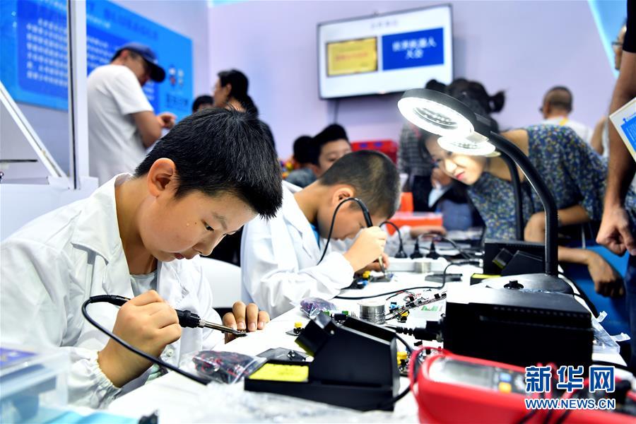 8月15日,小学六年级学生姚思危(左)在一个机器人儿童培训学院展台焊接用于编程的模块。 当日,2018世界机器人大会在北京亦创国际会展中心开幕。大会以“共创智慧新动能,共享开放新时代”为主题,由论坛、博览会、大赛、地面无人系统活动四大板块组成。 新华社记者 李鑫 摄