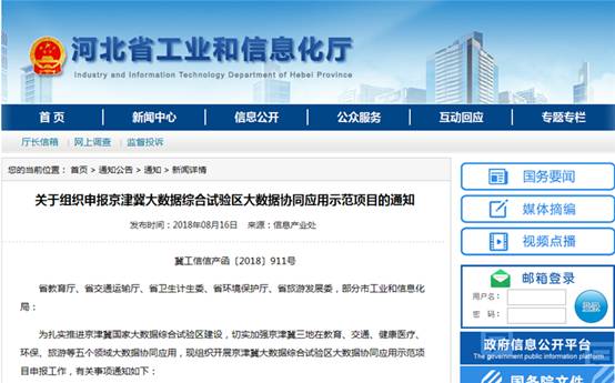 日前,河北省工信厅印发通知,即日起至8月25日,组织开展京津冀大数据综合试验区大数据协同应用示范项目申报工作。