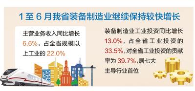 从数据看,1至6月,我省装备制造业继续保持较快增长,主营业务收入同比增长6.6%,占全省规模以上工业的22.0%;装备制造业工业投资同比增长13.0%,占全省工业投资的33.5%,对全省工业投资的贡献率为39.7%,居七大主导行业首位。