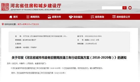 近日,河北省住建厅印发《河北省城市市政老旧管网改造三年行动实施方案(2018-2020年)》提出,结合城市(县城)总体规划和市政基础设施建设“十三五”规划,通过分期分步实施市政老旧管网三年改造,有效解决管网受损失修、漏损严重、爆管裂管等问题,消除市政管网安全隐患。确保到2020年底,全省现状市政供水、供热和燃气老旧管网改造率达80%以上,雨污分流制排水管网占现状排水管网总量达80%以上,其中各市、县每类现状市政老旧管网总量不足10公里的,改造率要达100%,实现“应改尽改、能改尽改”。