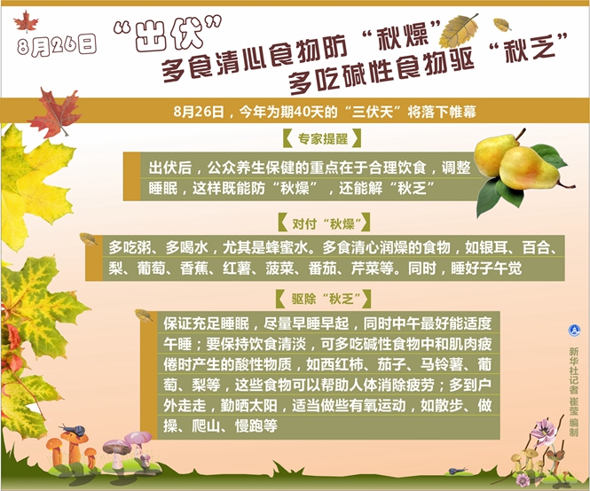 新华社天津8月25日电(记者周润健)8月26日,今年为期40天的“三伏天”将落下帷幕。出伏后气候干燥,人体很容易患上“秋燥”,同时,天气由热转凉,很多人也容易感到疲乏,也就是民间百姓常说的“秋乏”。专家提醒说,出伏后,公众养生保健的重点在于合理饮食,调整睡眠,这样既能防“秋燥”,还能解“秋乏”。