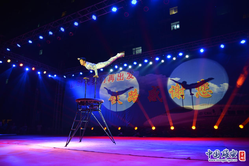当晚七点半,雄县雄州镇黄湾社区广场灯光璀璨、笑声一片。演出以“新时代,我们再出发”为主题,在大型合唱《起航雄安》中拉开帷幕,在近两个小时的精彩演出中,中铁文工团献上了歌曲、相声、朗诵、杂技、舞蹈等节目,观众热情高涨,拍手随声跟唱。